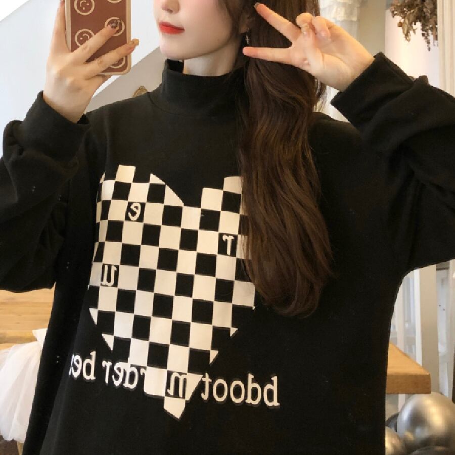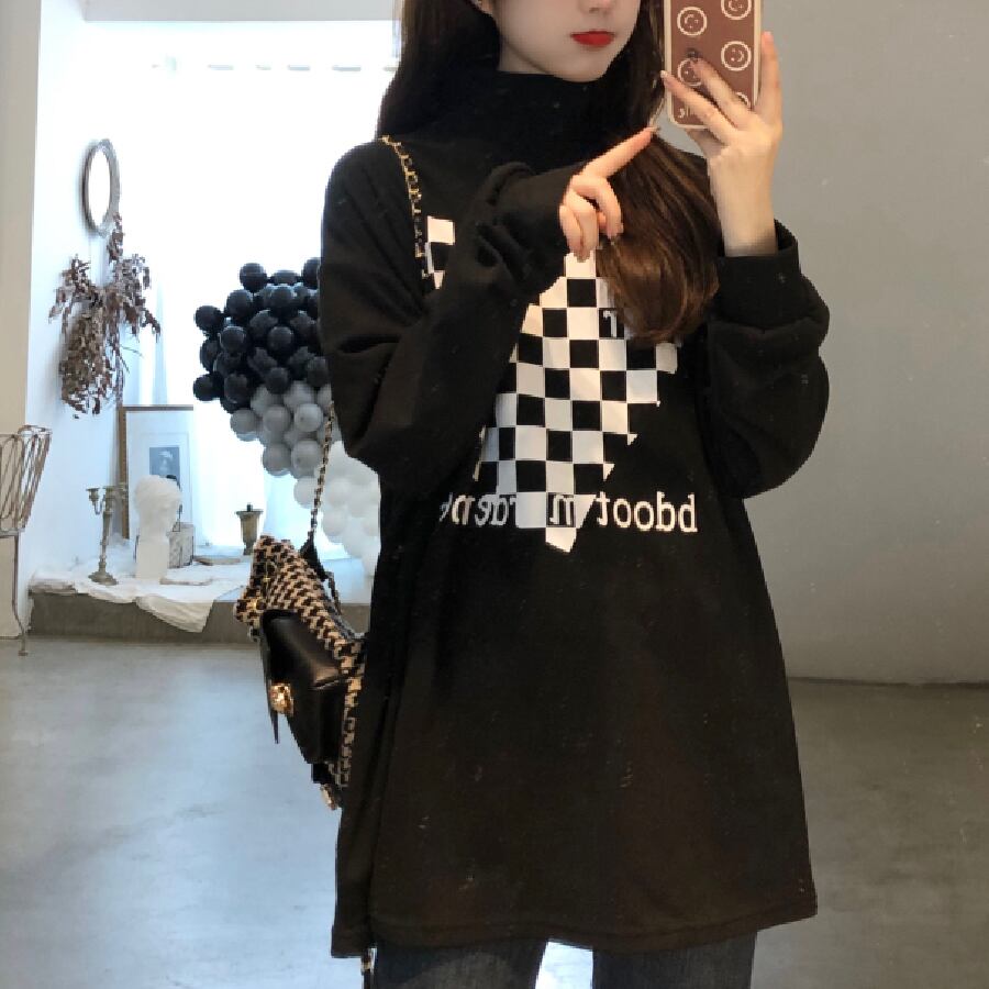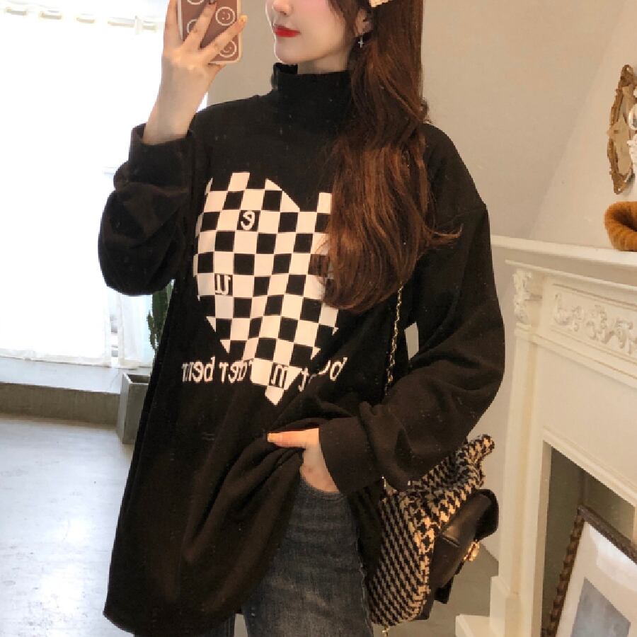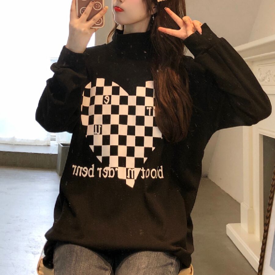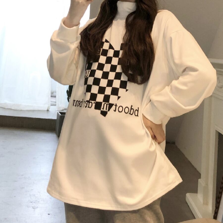 【韓国通販 dgo】チェッカーパターン ハイネックスウェットトップ 2カラー ホワイト/ブラック(W1500)トレンドアイテム
