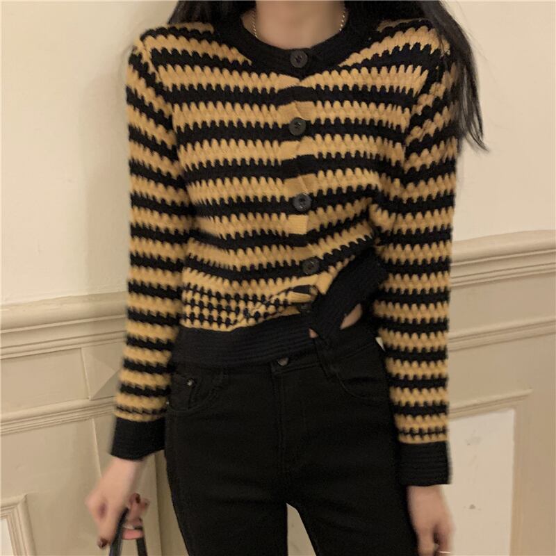 【韓国通販 dgo】ウェーブストライプニットカーディガン 新作2カラー カーキ/ブラック(W1502)