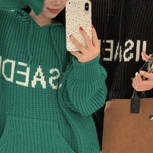 【韓国通販 dgo】レトロ ニットフーディー ビッグポケット付 秋冬2カラー グリーン/ブラック(W1583)