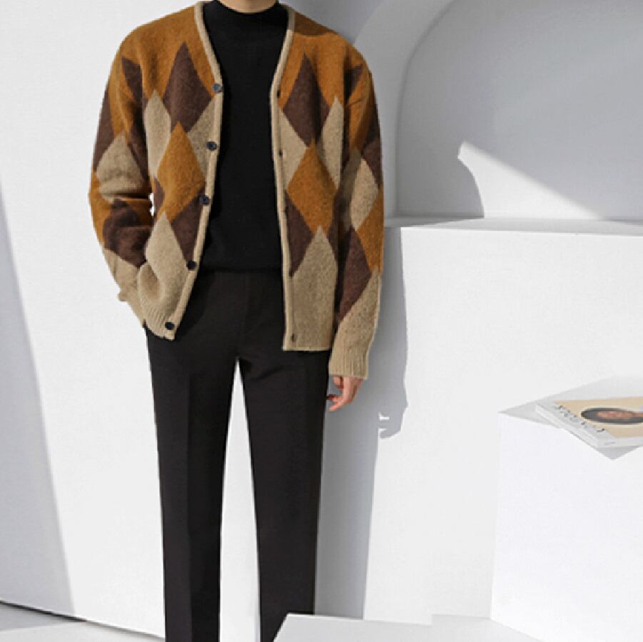 【韓国通販 dgo】ダイヤモンドチェック ニットカーディガン メンズ秋冬新作 ブラウン(M1616)