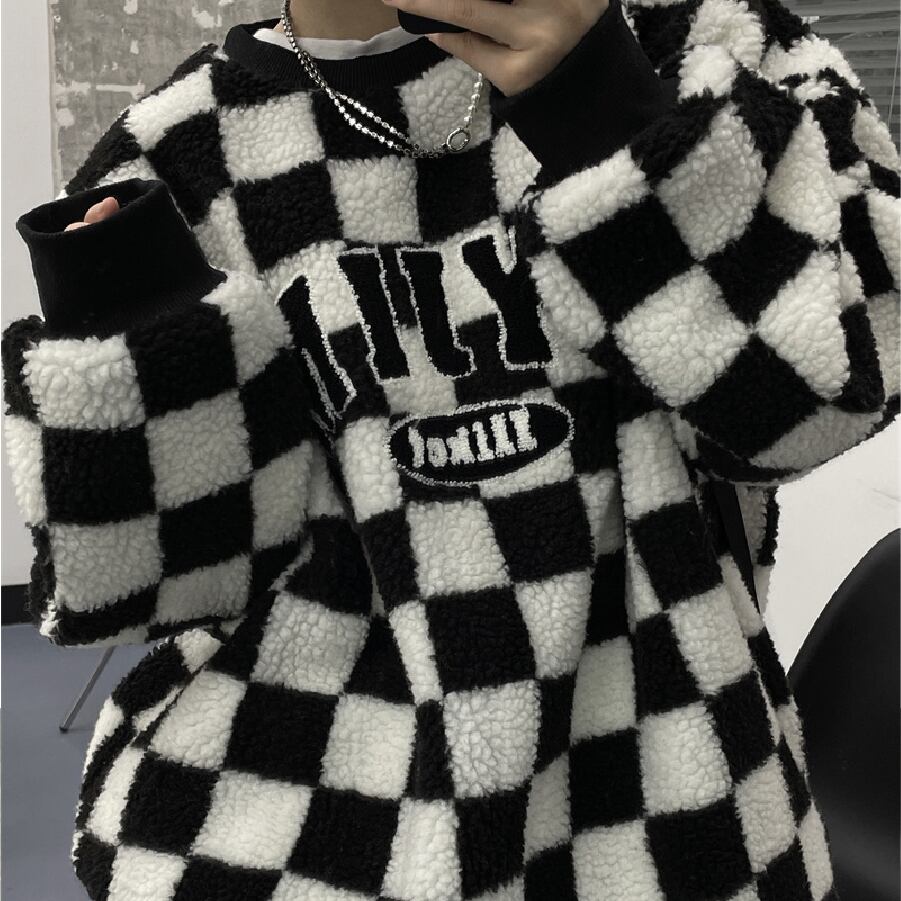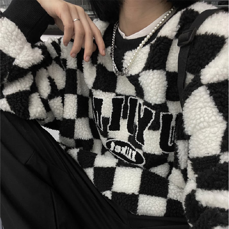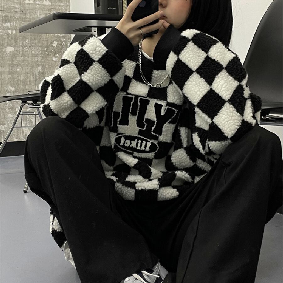 【韓国通販 dgo】ユニセックス ラウンドネック ベルベットセーター 2カラー ブラック&グレー、ホワイト&ブラック(M1659)