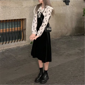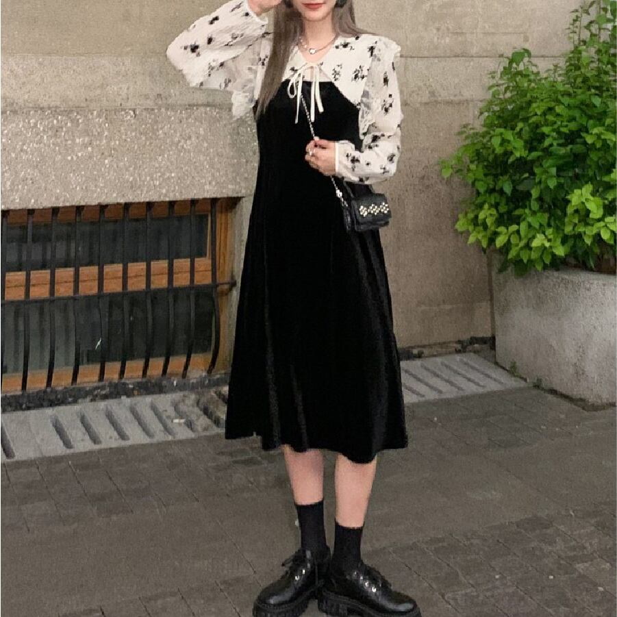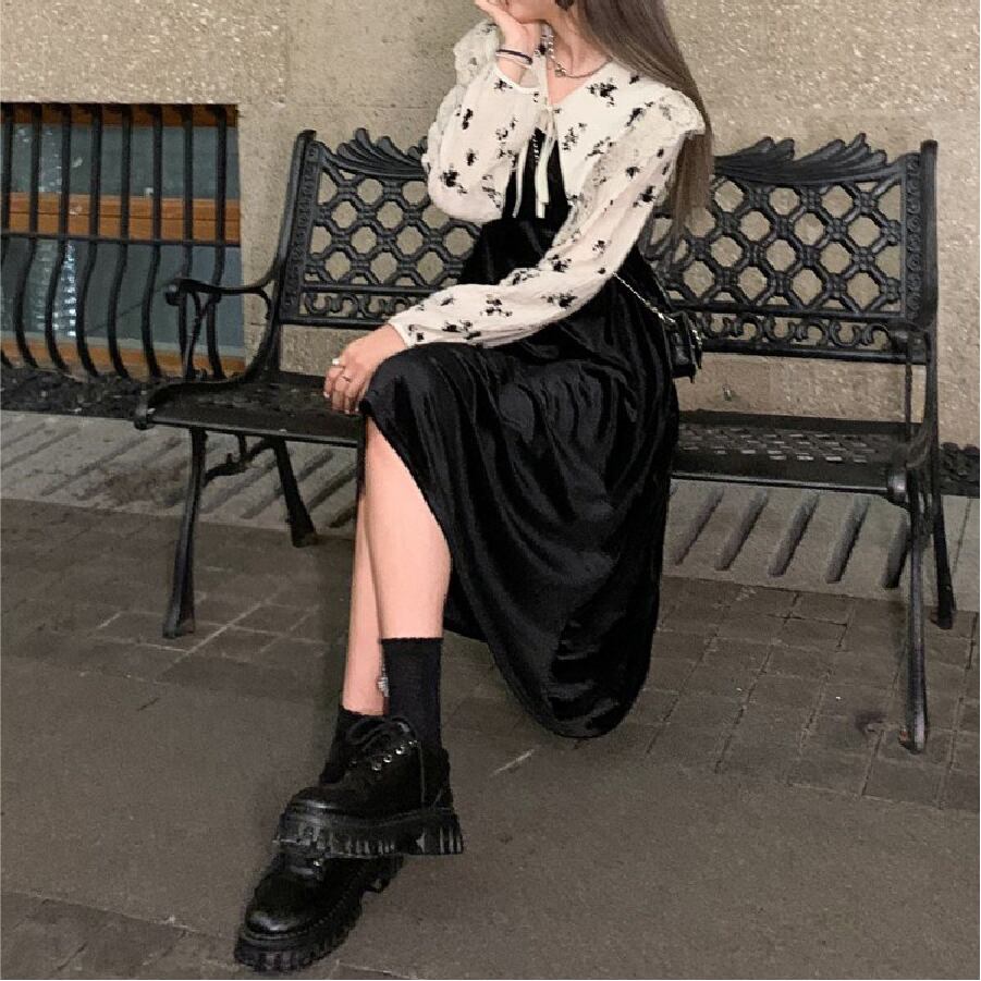 【韓国通販 dgo】レトロ ビッグカラーフローラル ワンピース ブラック(W1649)