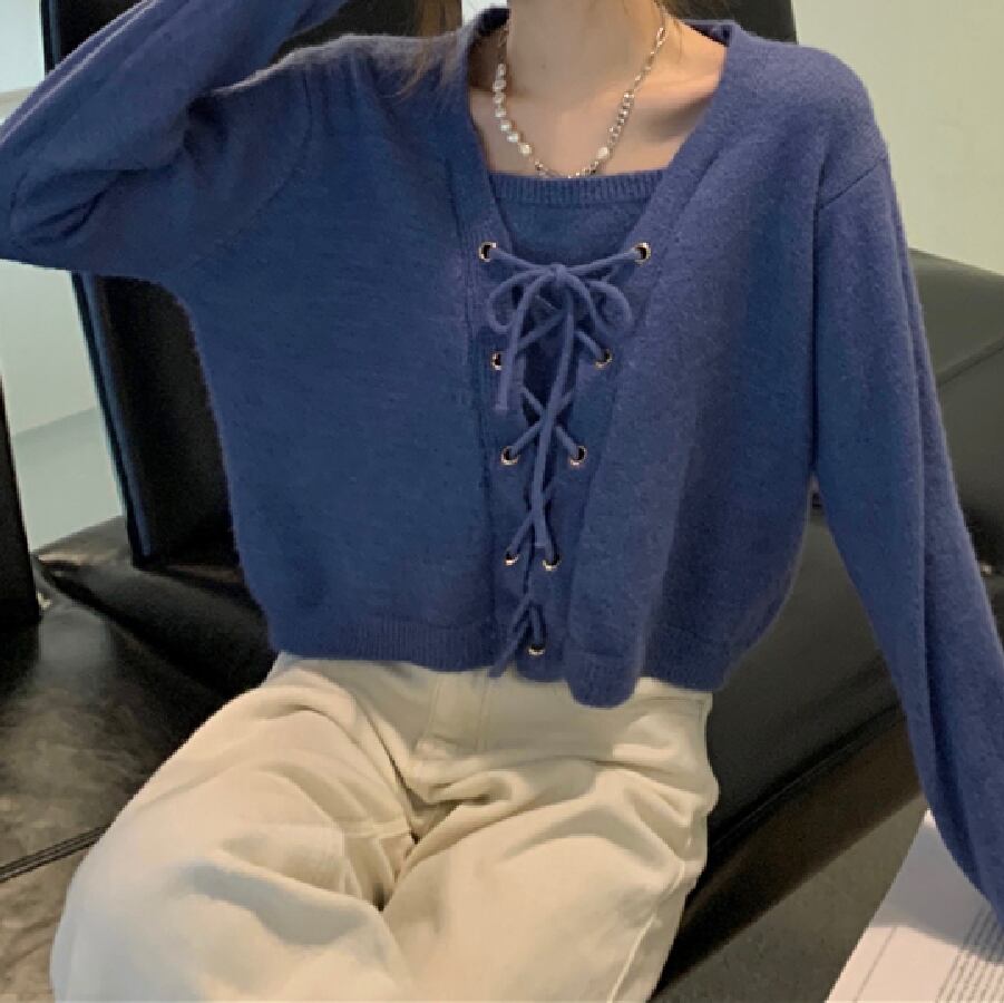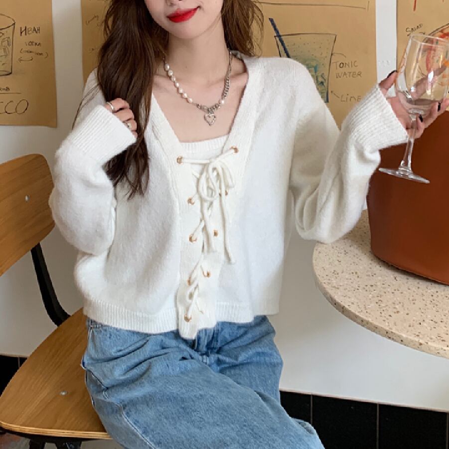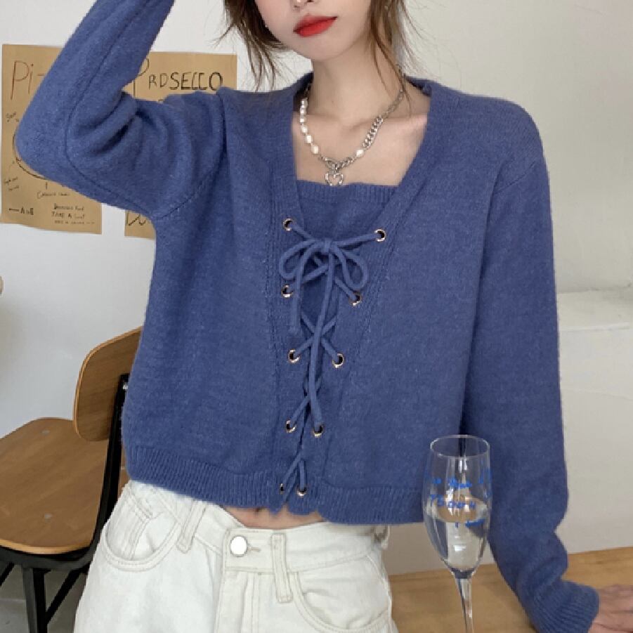 【韓国通販 dgo】レースアップショートニットトップス 3カラー アイボリー/ホワイト/ブルー(W1651)