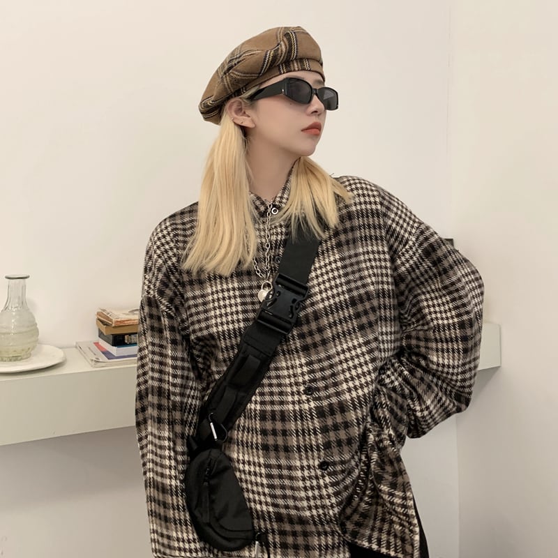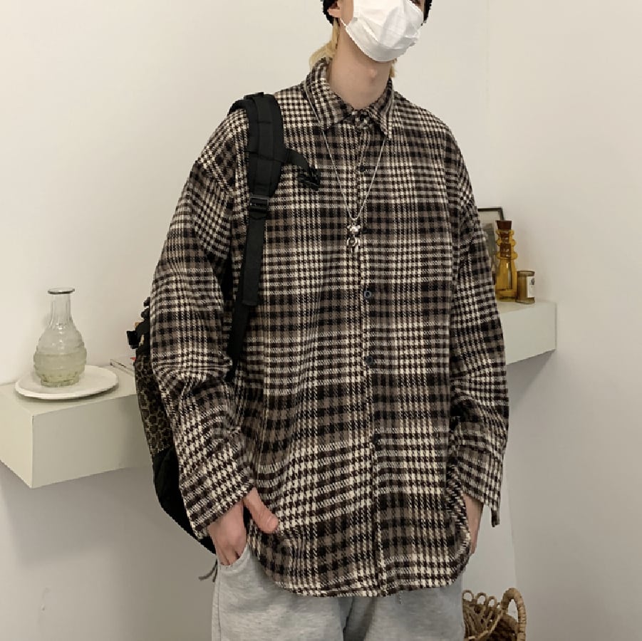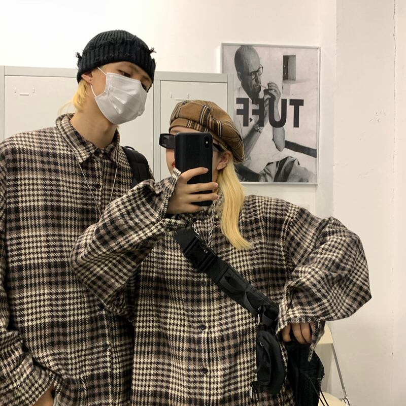 【韓国通販 dgo】ユニセックス ギンガムチェックオーバーサイズウールシャツ 2カラー ブラウン(M1708)