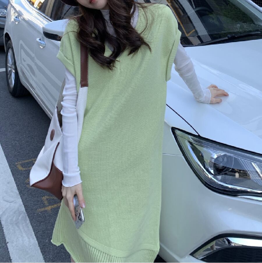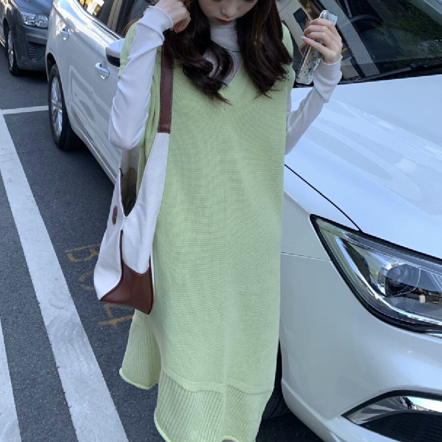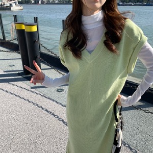 【韓国通販 dgo】Vネックミドル丈リブワンピース ライトグリーン(W1758)