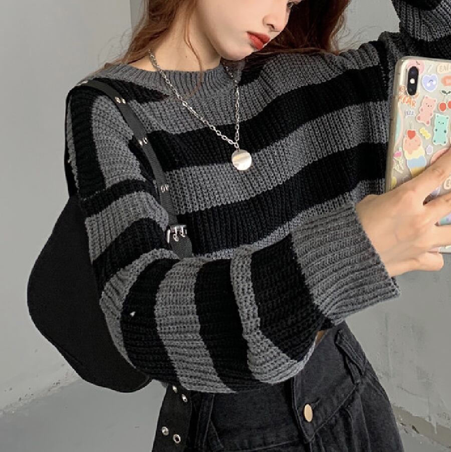 【韓国通販 dgo】ストライプショート丈リブニット グレー(W1803)