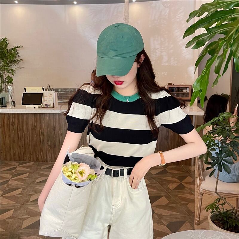 【韓国通販 dgo】ストライプパフスリーブトップス 2colors ブルー&レッド、ブラック&グリーン(W2016)センス溢れるファッションitem