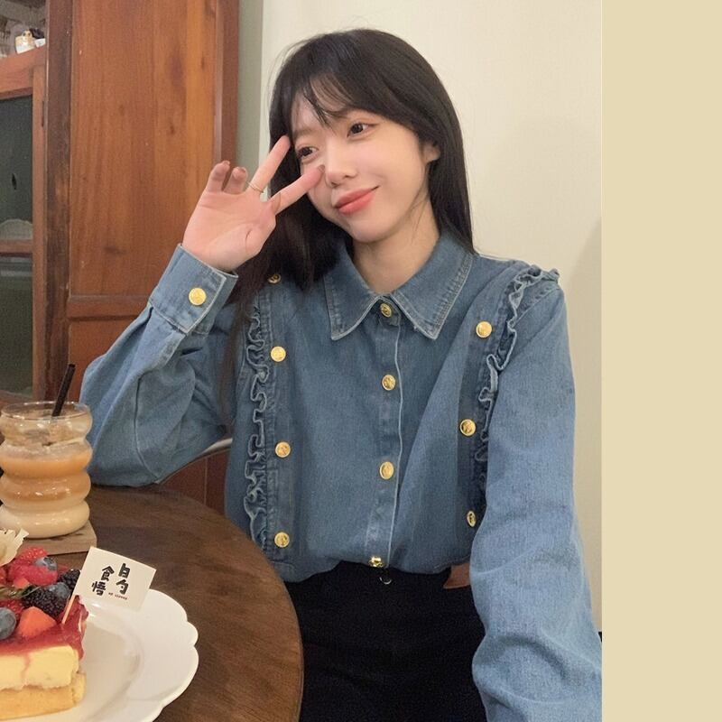 【韓国通販 dgo】フリル付きポロ襟デニムシャツ 春秋 ブルー(W2040)トレンドアイテム