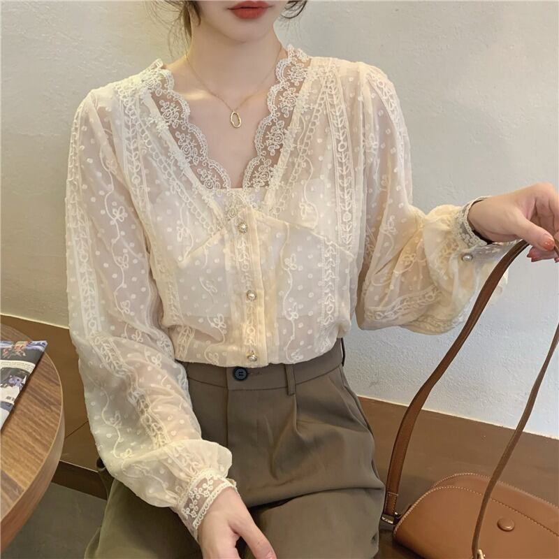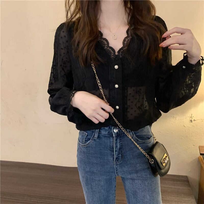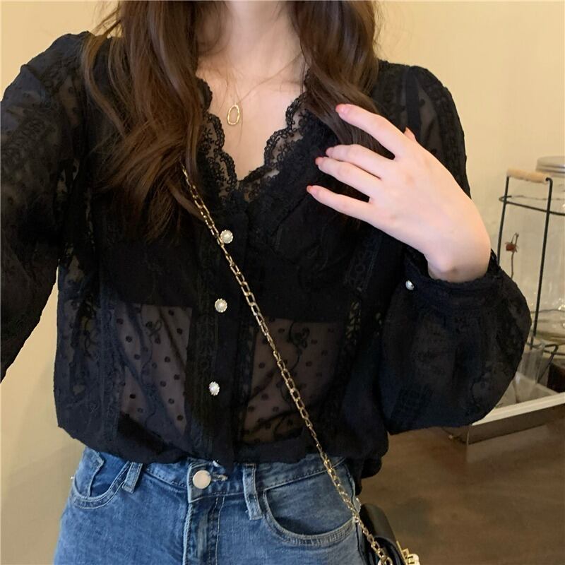 【韓国通販 dgo】Vネックレースシアーシャツ アイボリー/ブラック(W2052)