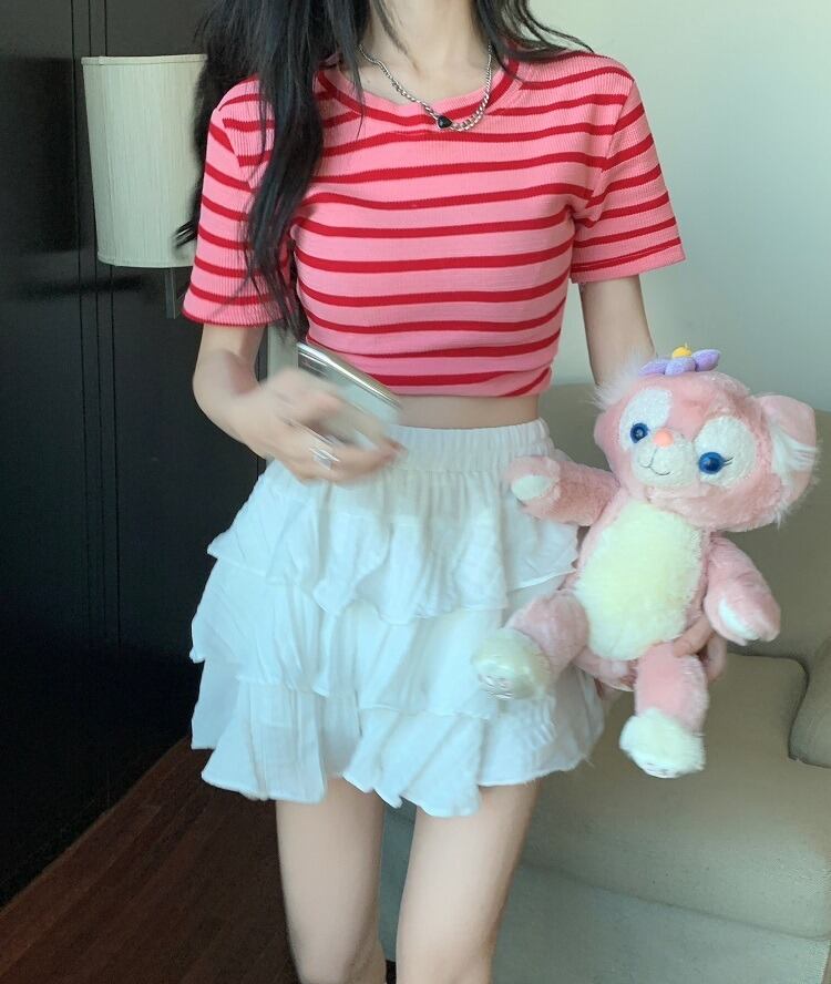 【韓国通販 dgo】ストライプショートニット 春夏 3colors レッド/パープル/ブラック(W2176)センス溢れるファッションitem