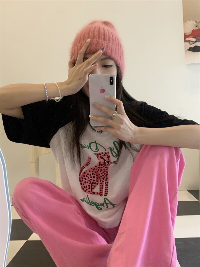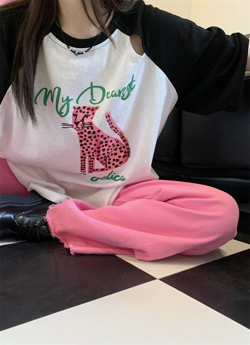 【韓国通販 dgo】ラグランスリーブTシャツ"pink leopard" ホワイト(W2239)トレンドアイテム