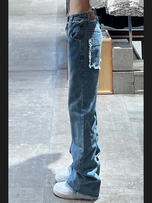 【韓国通販 dgo】フリンジバックポケットストレートジーンズ ブルー(W2230)トレンドアイテム