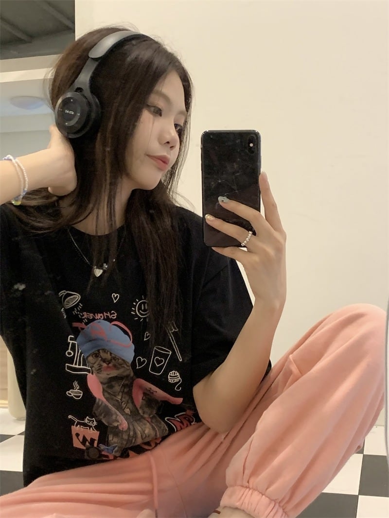 【韓国通販 dgo】2colors キャットプリントTシャツ ホワイト/ブラック(M2583)センス溢れるファッションitem