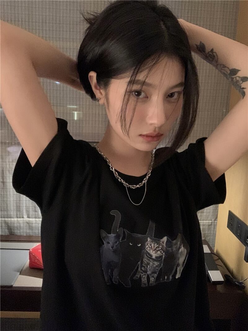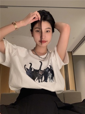 【韓国通販 dgo】2colors キャットプリントTシャツ ホワイト/ブラック(M2599)トレンドアイテム