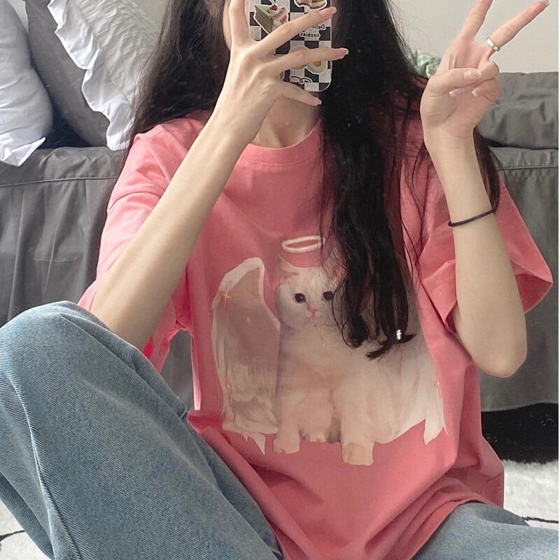 【韓国通販 dgo】オーバーサイズサマーTシャツ"エンジェルキャット" ピンク(M2526)センス溢れるファッションitem