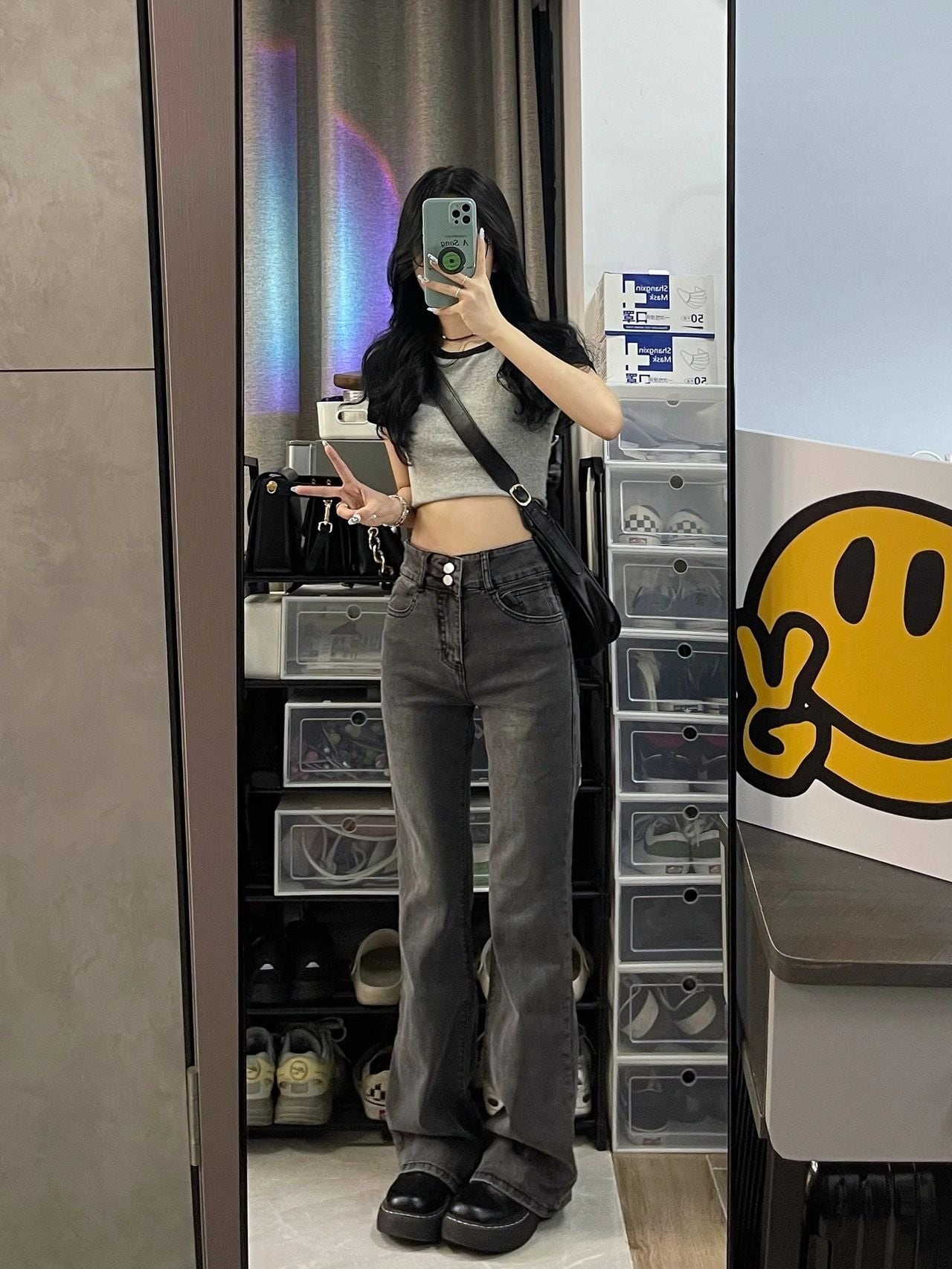 【韓国通販 dgo】ハイウエストマイクロフレアジーンズ ブラックグレー(M2531)センス溢れるファッションitem