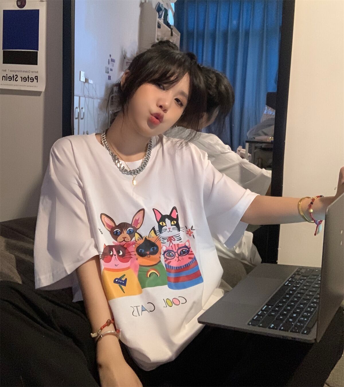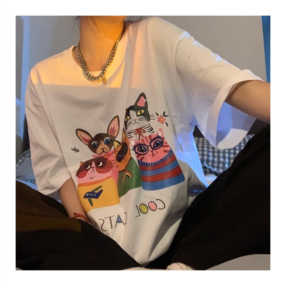 【韓国通販 dgo】クルーネックプリントTシャツ"five cat's" ホワイト(W2557)トレンドアイテム