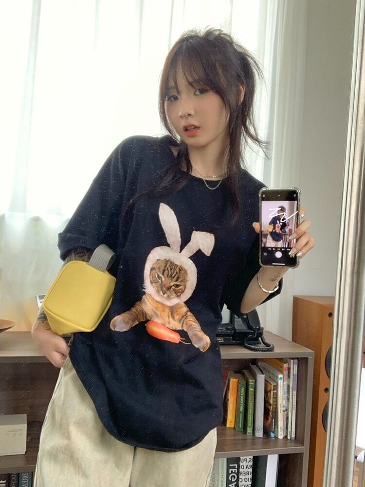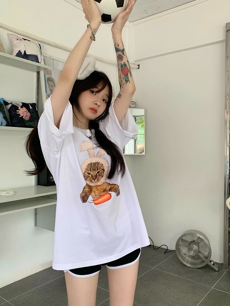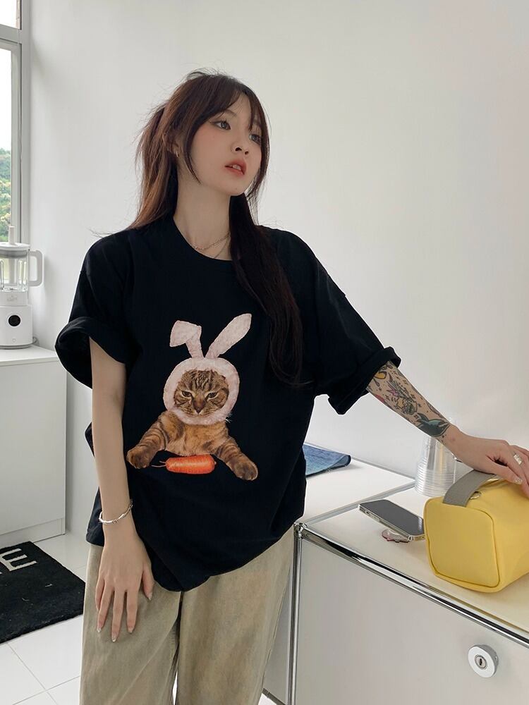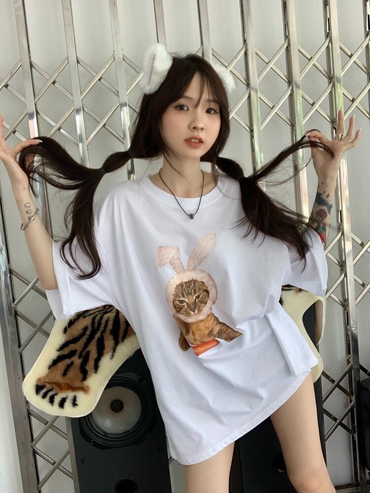 【韓国通販 dgo】オーバーサイズクルーネックTシャツ"うさ耳キャット" ホワイト/ブラック(W2543)センス溢れるファッションitem