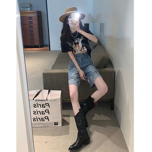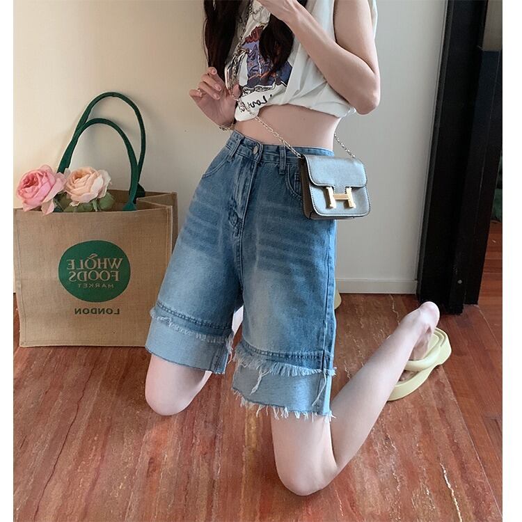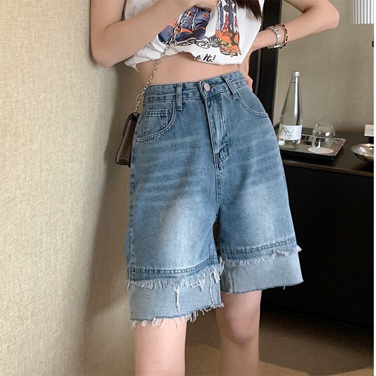 【韓国通販 dgo】ハイウエストストレートハーフジーンズ ブルー(W2669)トレンドアイテム