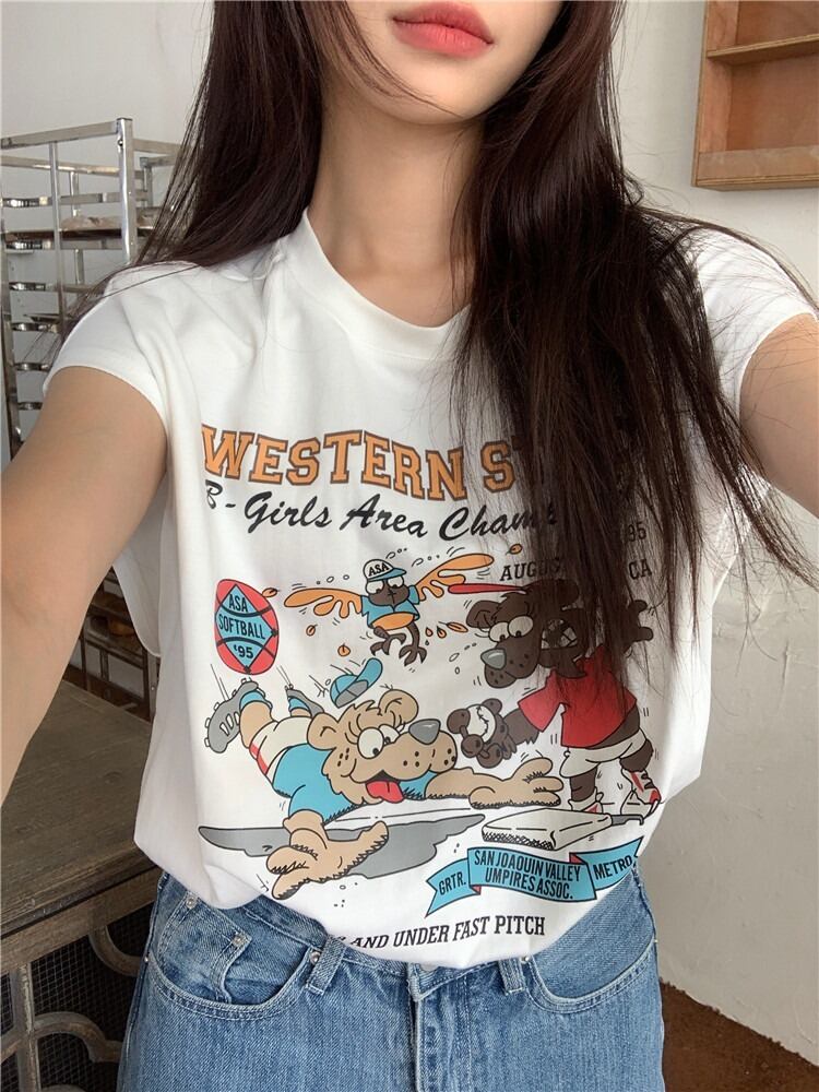 【韓国通販 dgo】2colors スリーブレスプリントTシャツ ブラック/ホワイト(W2719)センス溢れるファッションitem