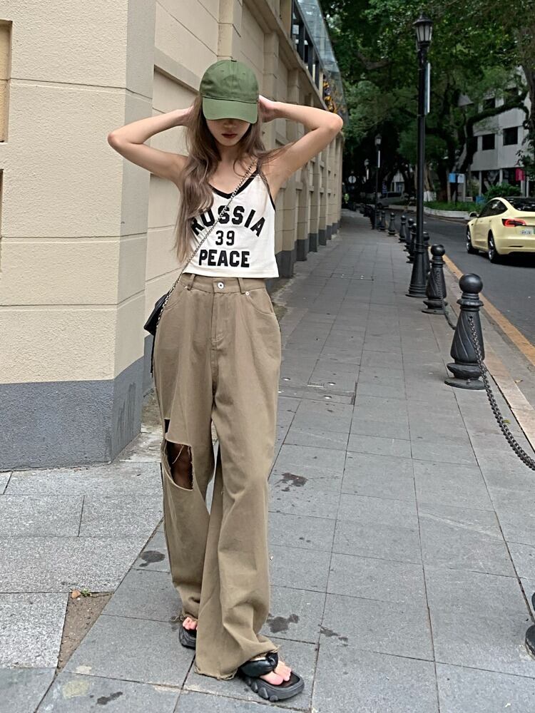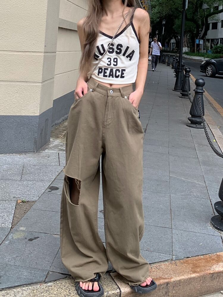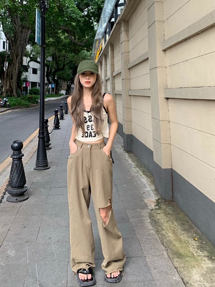 【韓国通販 dgo】ハイウエストルーズワイドレッグパンツ カーキ(W2713)センス溢れるファッションitem