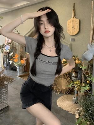 【韓国通販 dgo】スクエアネック英レタープリントクロップドTシャツ グレー(W2737)トレンドアイテム