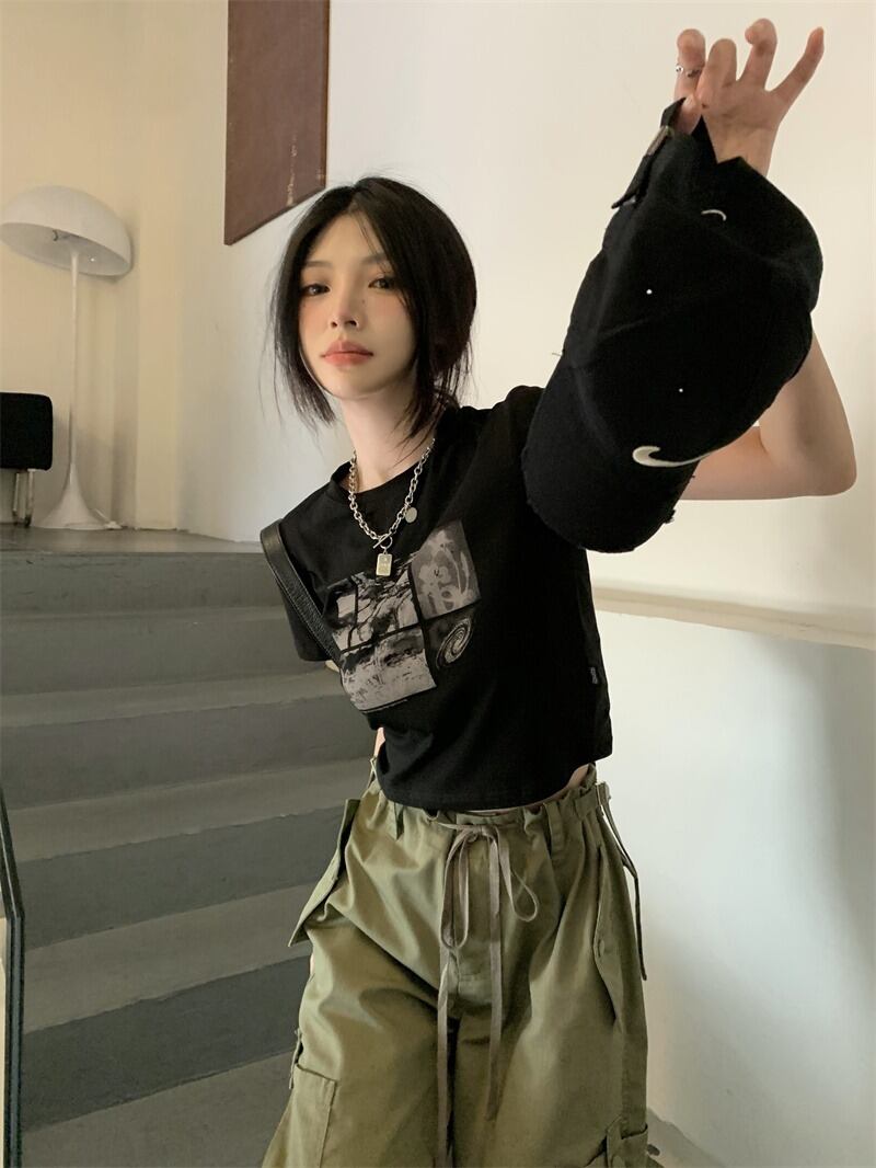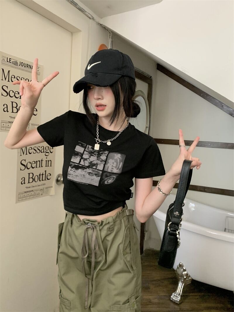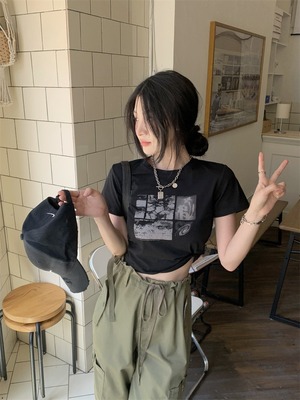 【韓国通販 dgo】クロップドフォトプリントT ブラック(W2799)トレンドアイテム