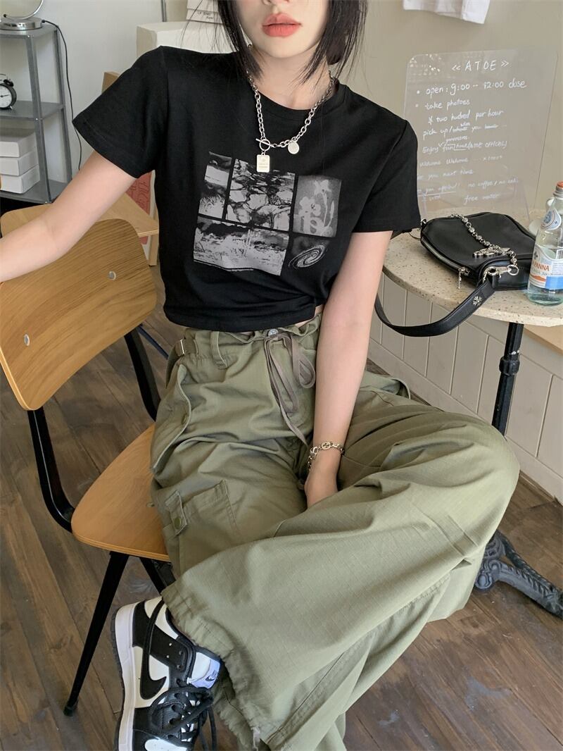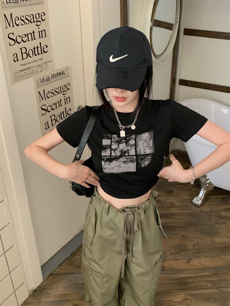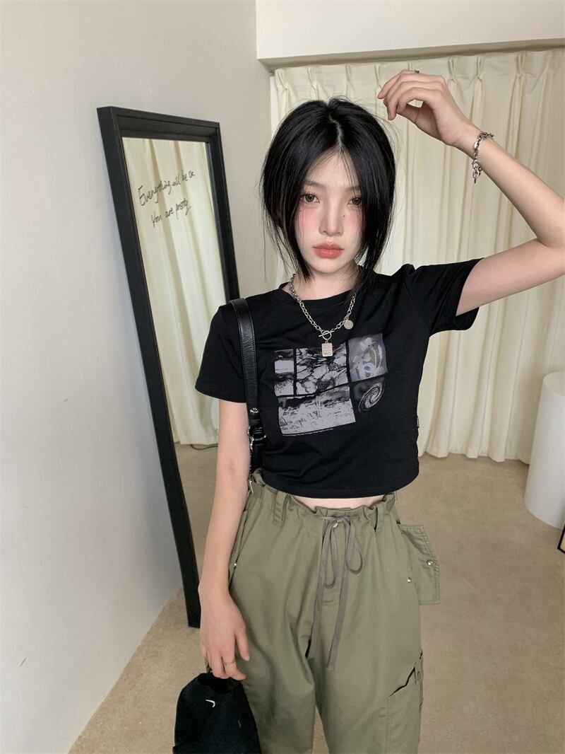 【韓国通販 dgo】クロップドプリントTシャツ ブラック(W2837)トレンドアイテム