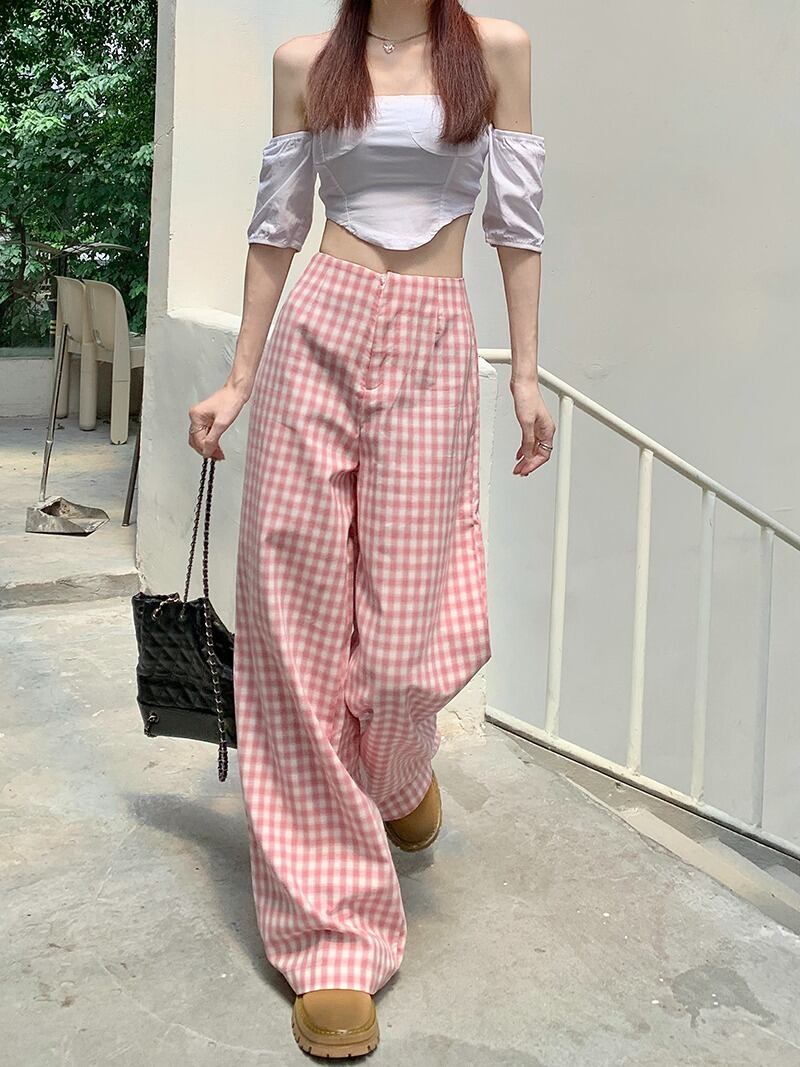 【韓国通販 dgo】ハイウエストチェック柄ワイドレッグパンツ ピンク(W2829)センス溢れるファッションitem