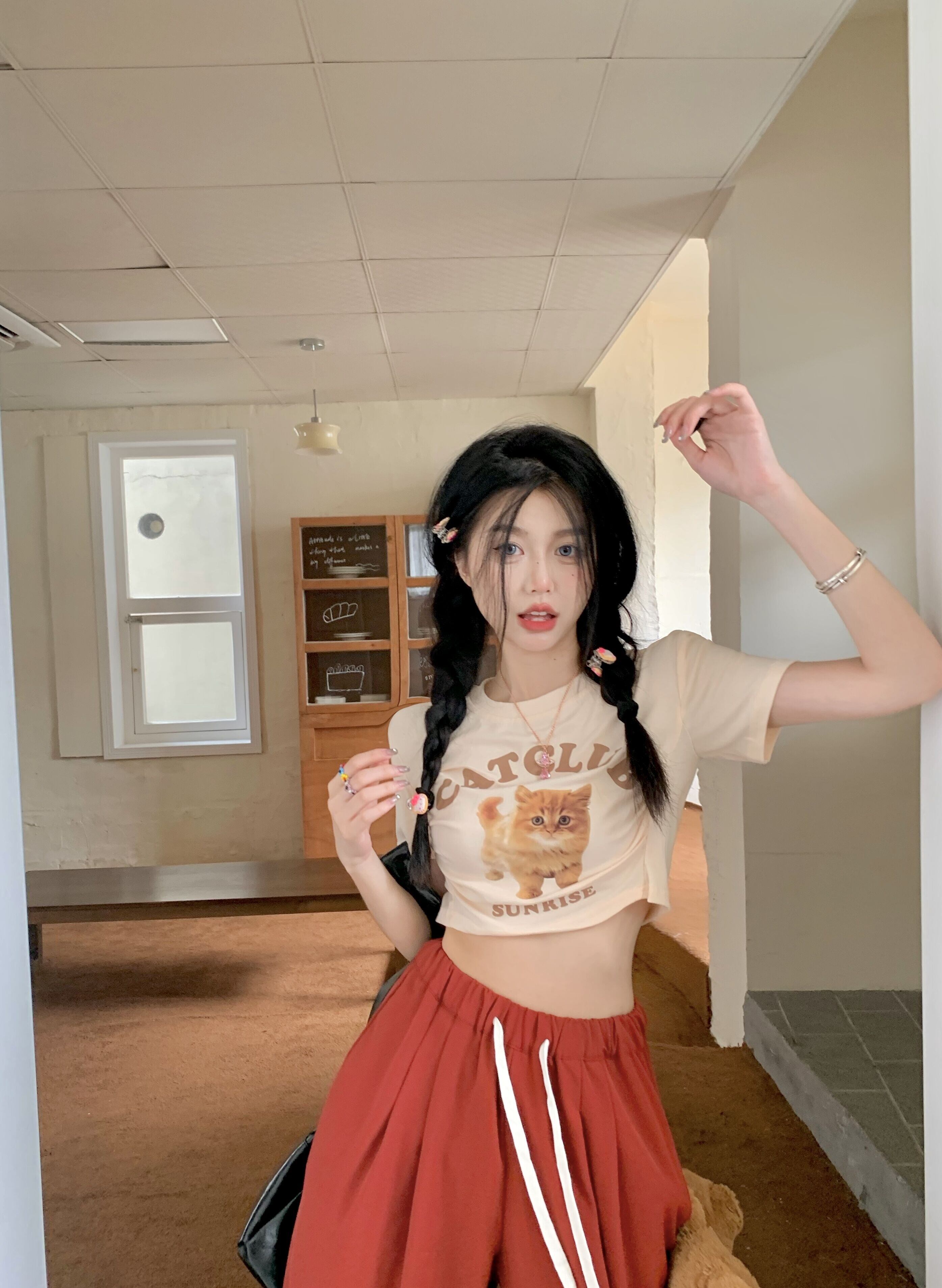 【韓国通販 dgo】2colors クロップドキャットプリントT スカイブルー/ライトイエロー(W2863)センス溢れるファッションitem
