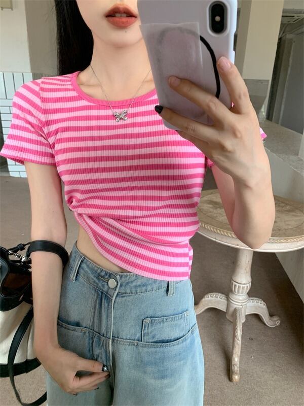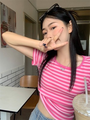 【韓国通販 dgo】2colors ストライプショートトップス ピンク/ブラック(W2903)センス溢れるファッションitem
