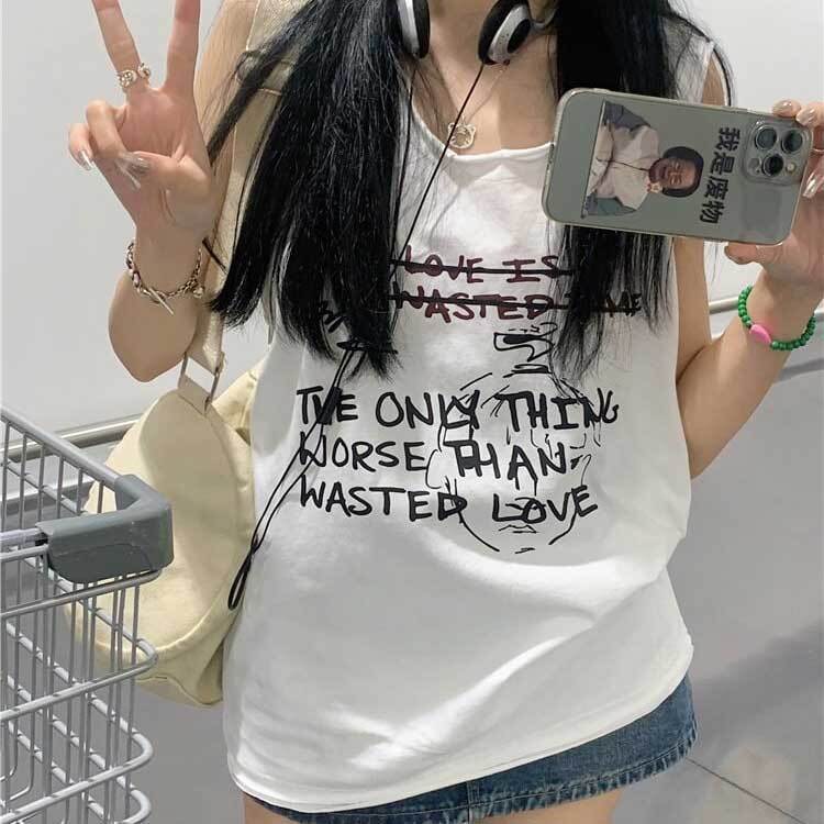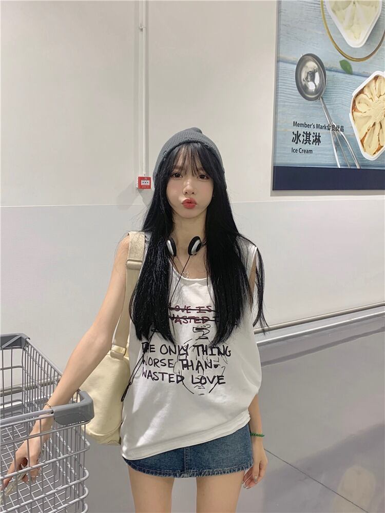 【韓国通販 dgo】2colors 英レタープリントスリーブレストップス ホワイト/グレー(W2888)