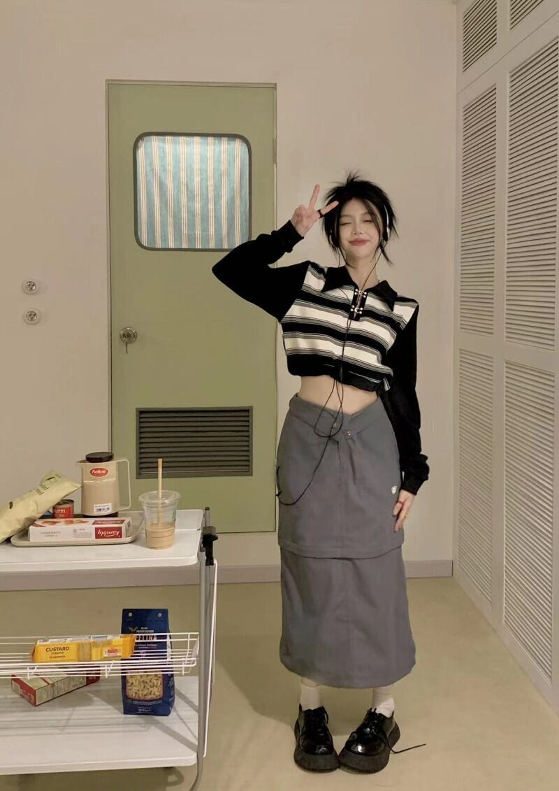 【韓国通販 dgo】ショート丈ストライプニット ホワイト&ブラック(W3024)