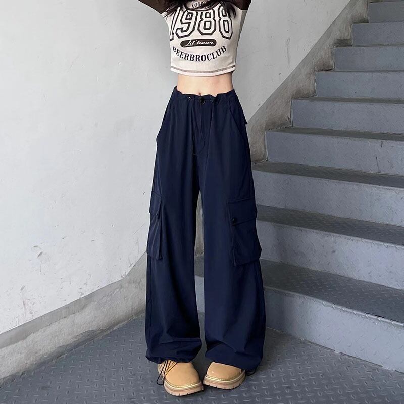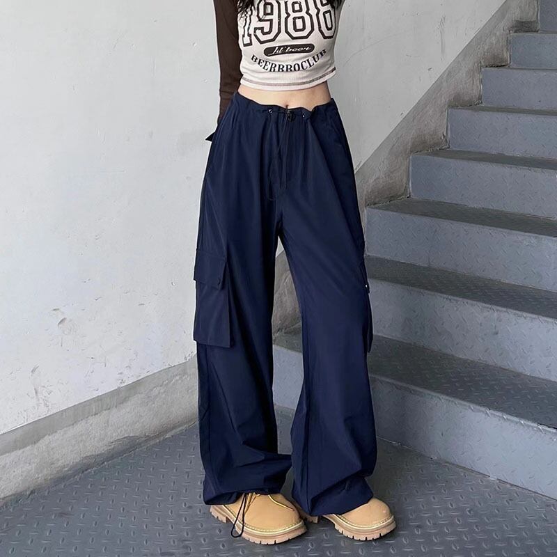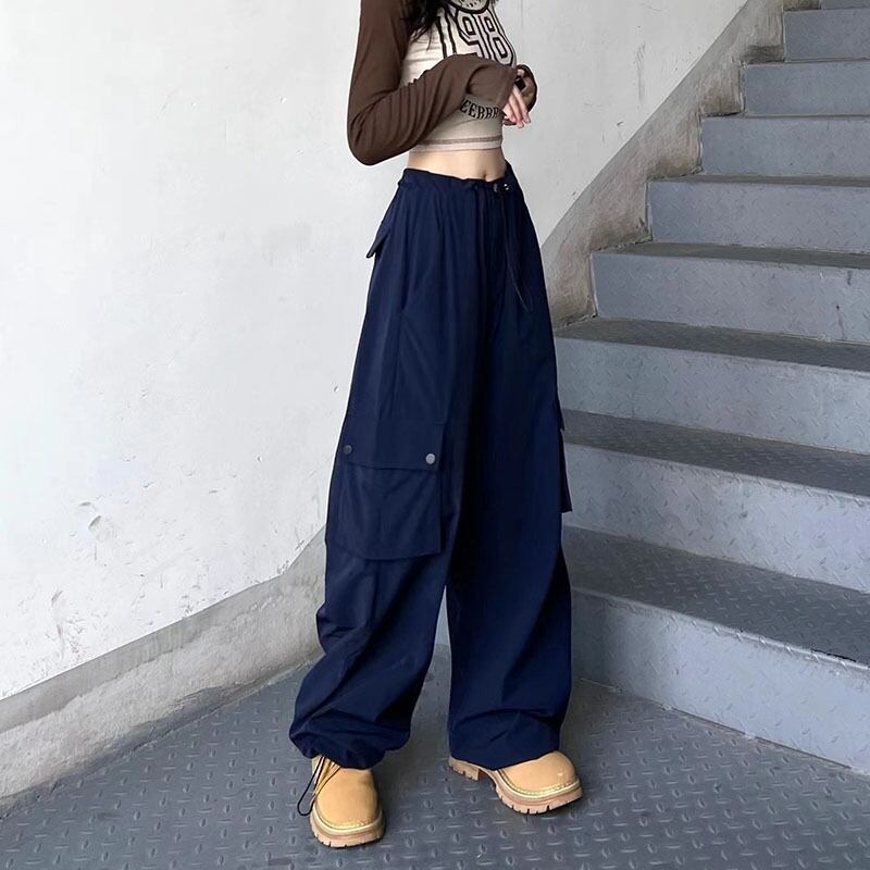 【韓国通販 dgo】ハイウエスト ワイドレッグ カーゴパンツ ネイビー(W3118)