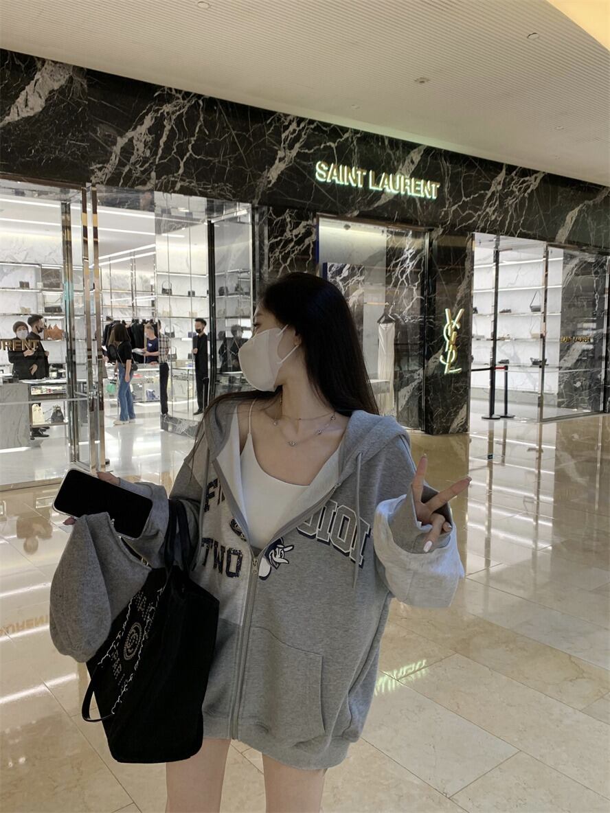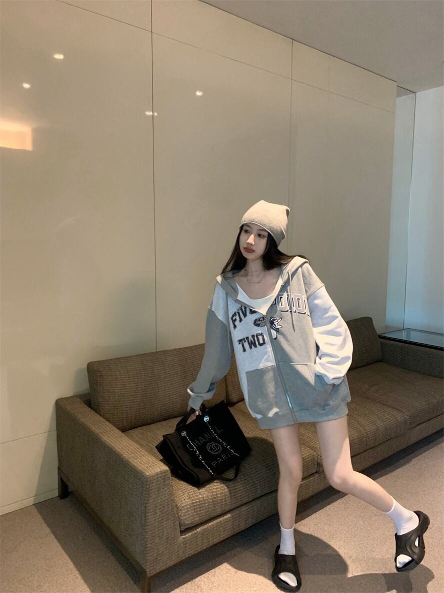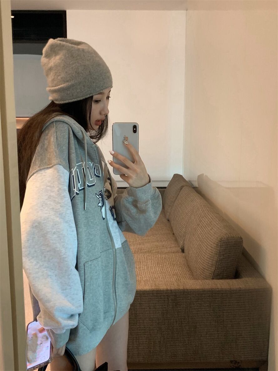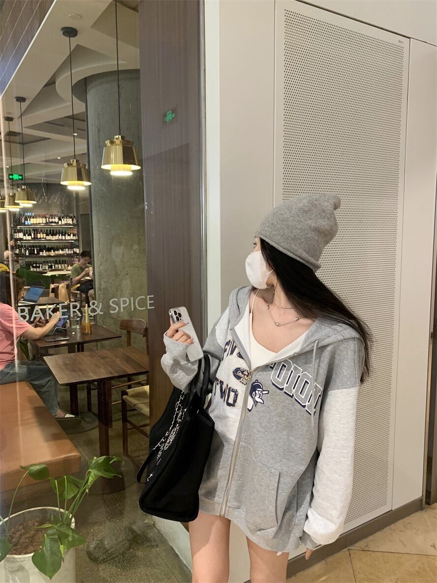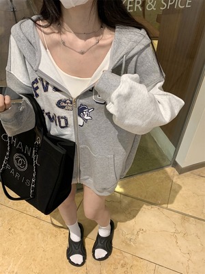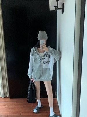 【韓国通販 dgo】ステッチ プリント ZIP付き フーディー グレー(W3092)