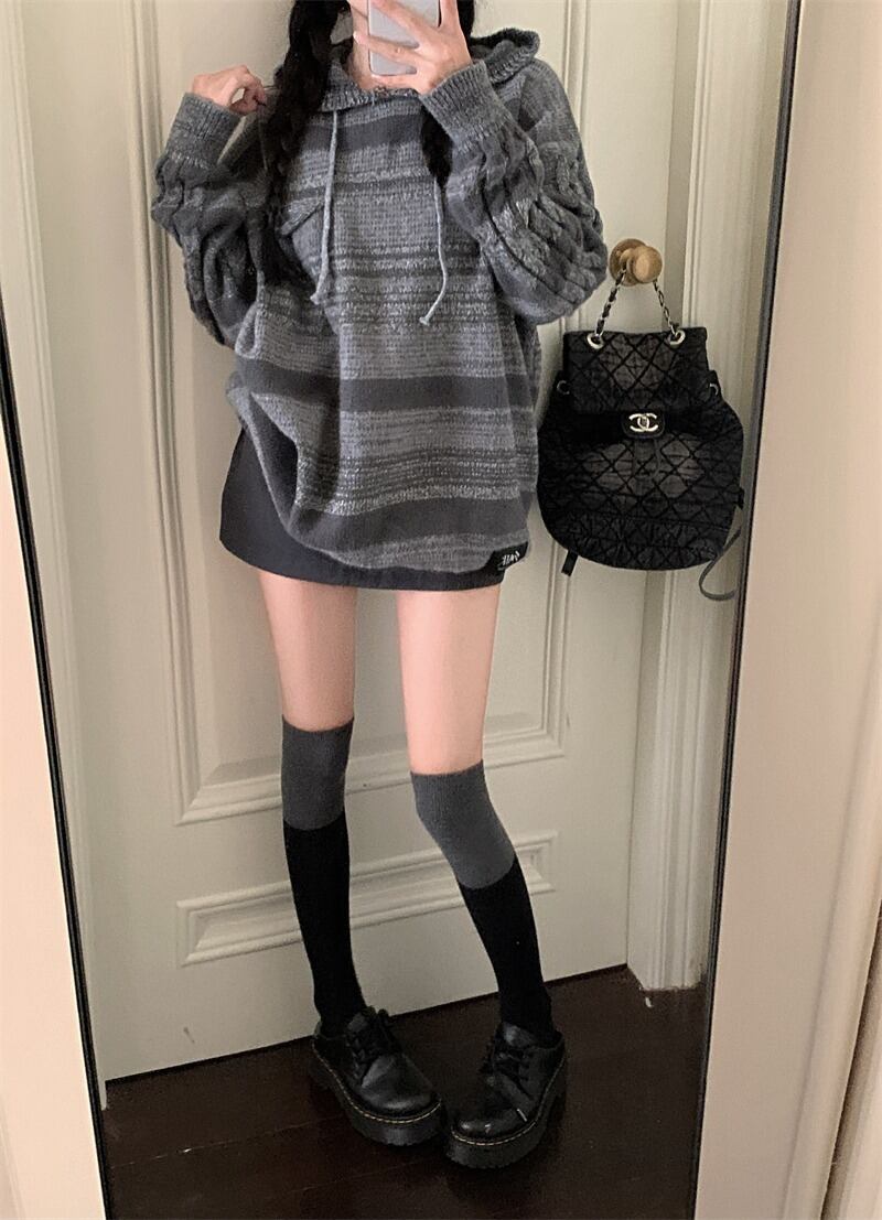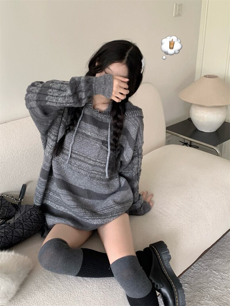 【韓国通販 dgo】プルオーバー フード付きニット 秋冬 グレー(W3198)
