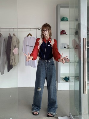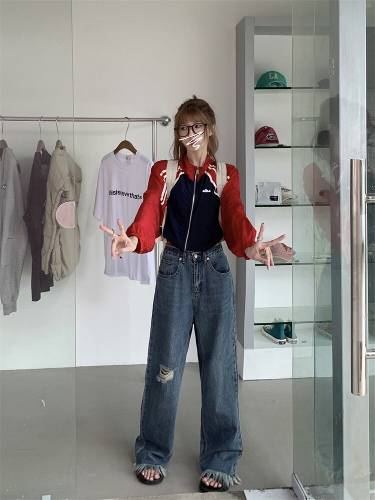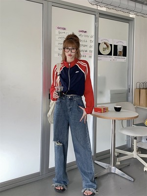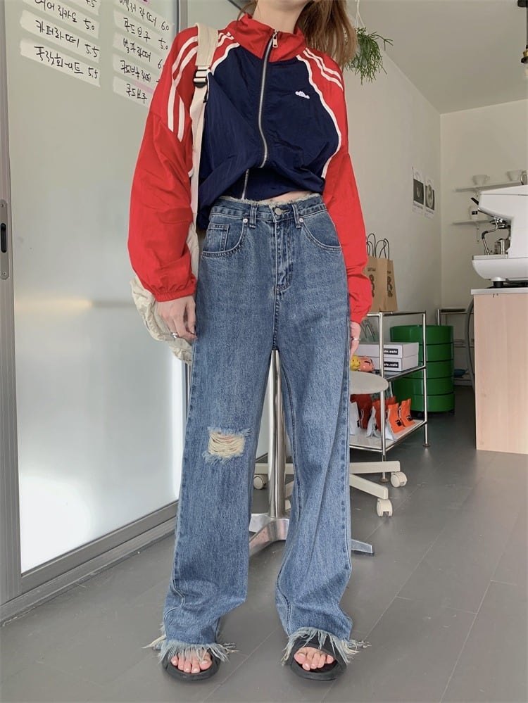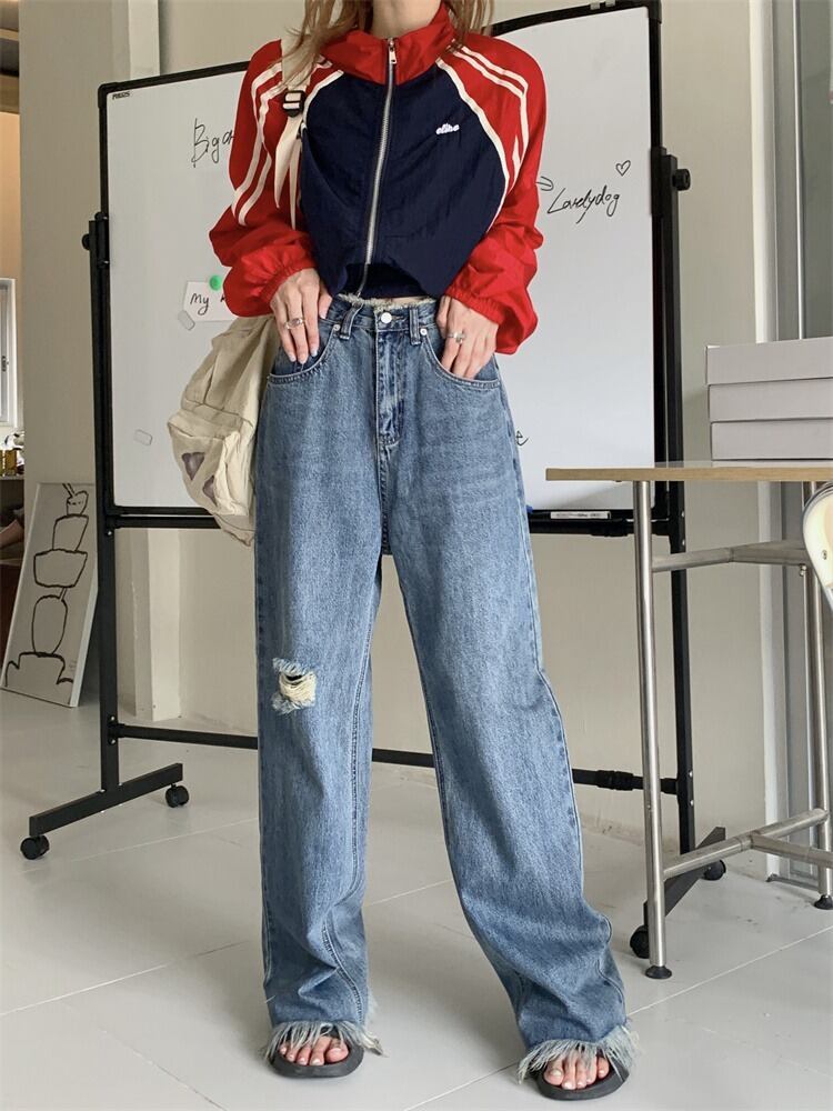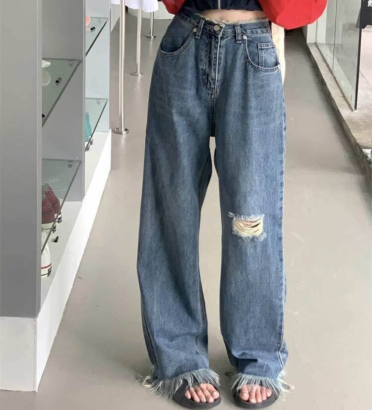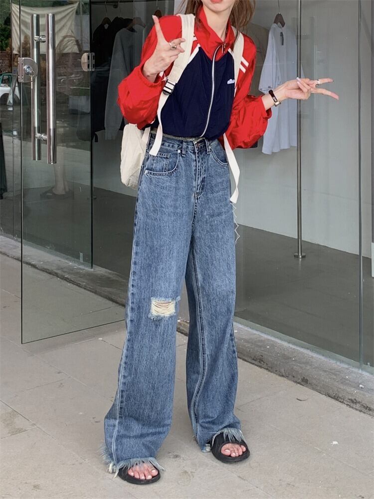 【韓国通販 dgo】ハイウエスト ワイドレッグ リップドジーンズ ブルー(W3170)センス溢れるファッションitem
