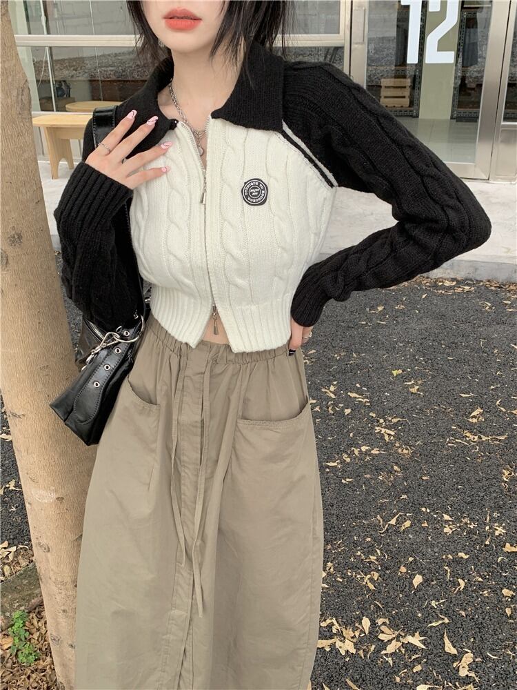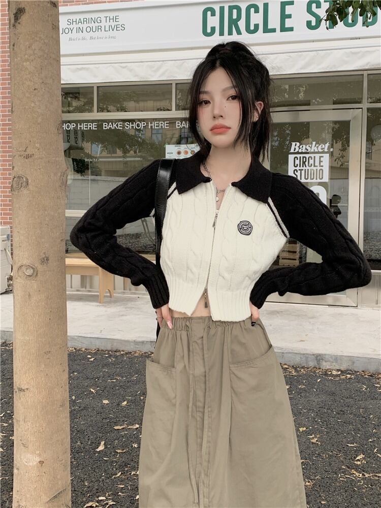 【韓国通販 dgo】バイカラー クロップド ニットジャケット ブラック+ホワイト(W3166)気分はジャケット!