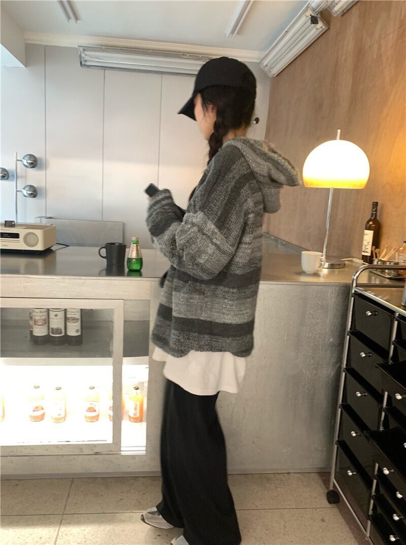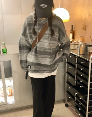【韓国通販 dgo】ストライプ プルオーバー ニット フーディー グレー(W3162)