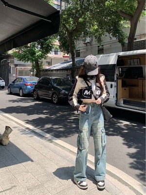 【韓国通販 dgo】ハイウエスト マルチポケット カーゴパンツ ブルー(W3250)トレンドアイテム