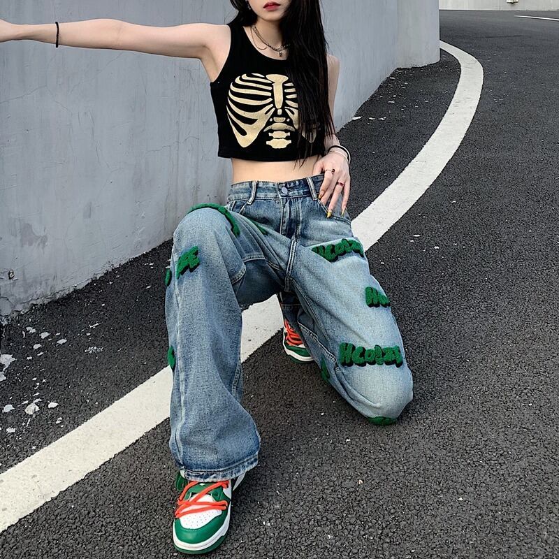 【韓国通販 dgo】ユニセックス レター刺繍 カジュアル ジーンズ(M3482)