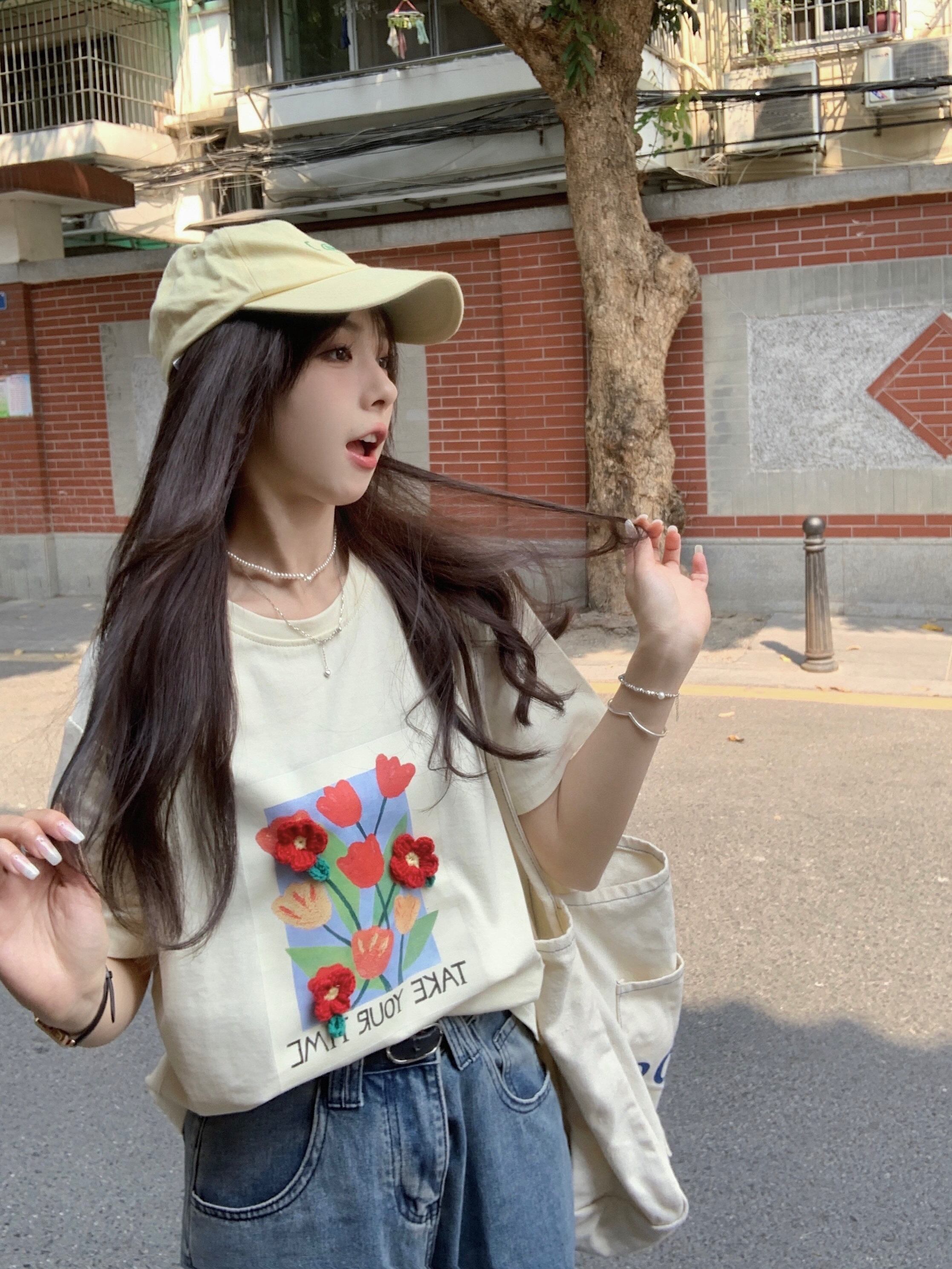 【韓国通販 dgo】ラウンドネック プリントTシャツ クリームイエロー(W3657)トレンドアイテム