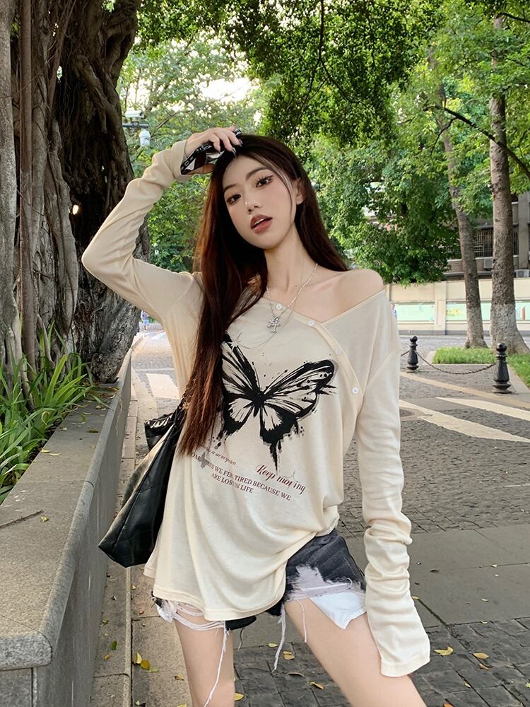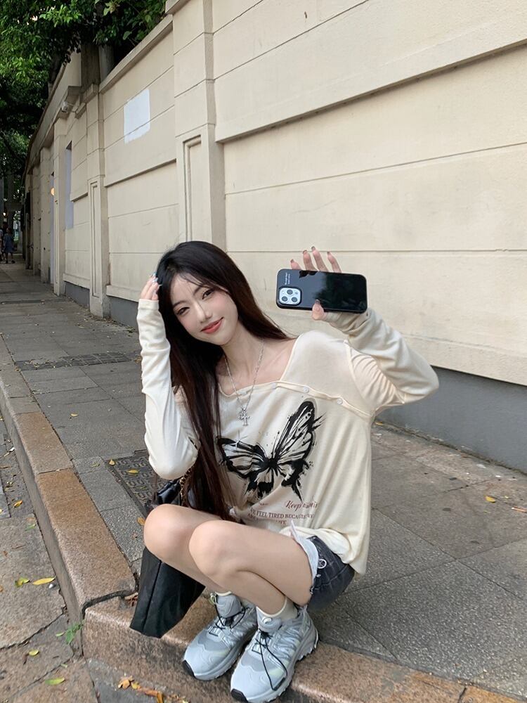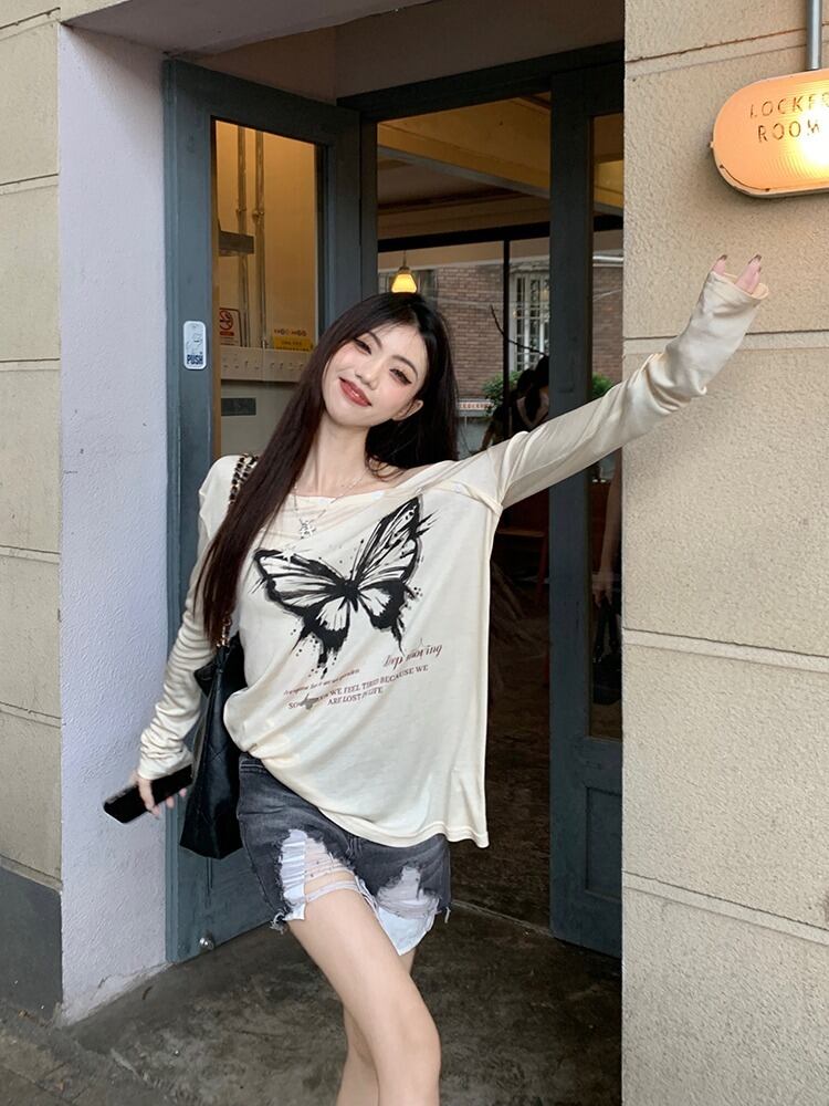 【韓国通販 dgo】バタフライプリント ロンT アイボリー(W3917)センス溢れるファッションitem