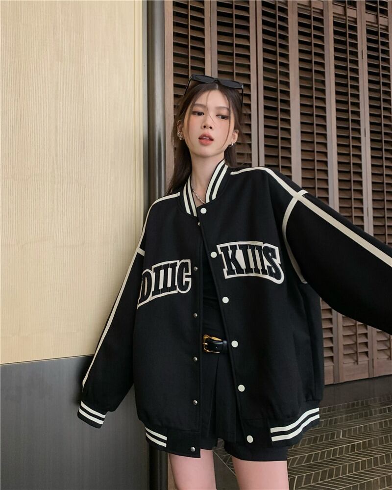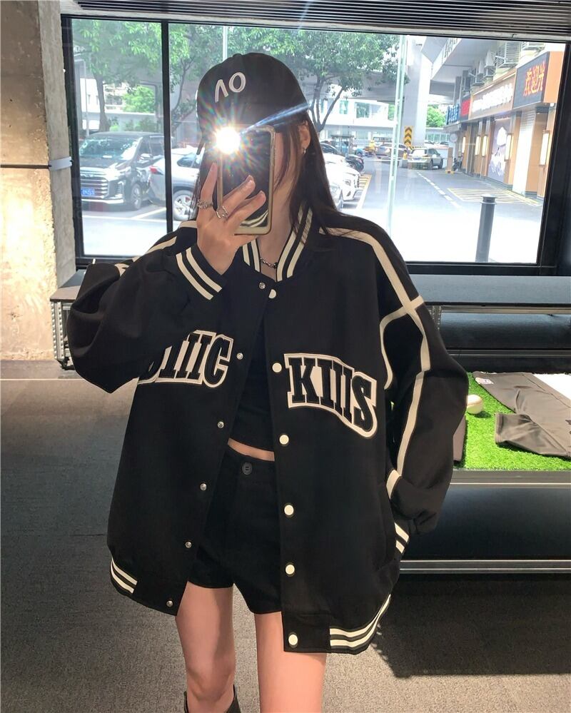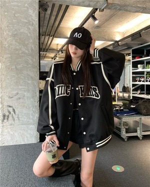 【韓国通販 dgo】レタープリント バーシティジャケット ブラック(W3929)気分はジャケット!